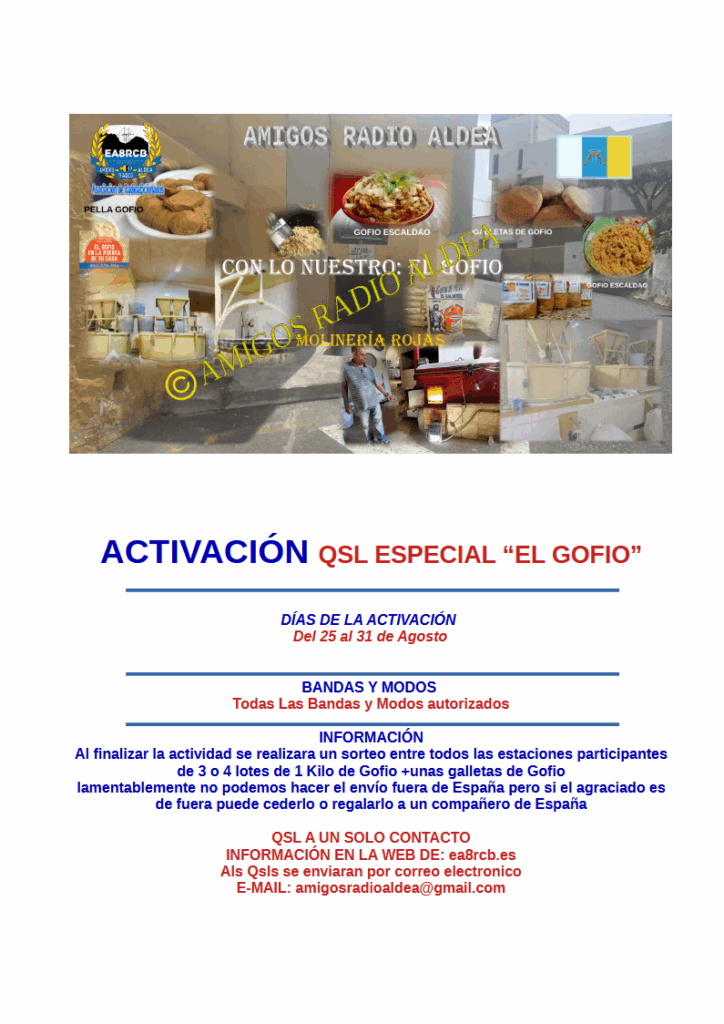 La próxima semana estaremos entregando una Qsl Especial dedicada al Gofio y al Molino de Rojas en Galdar Qsl a un solo contacto, entre todos los contactos se sortearan 4 kilos de Gofio gentileza del Molino De Rojas entraran todos los contactos, pero solo podemos enviar a zona EA, pero si el afortunado es de fuera de esta zona puede cederlo al compañero que desee. Agradecemos a Molino de Rojas la predisposición a cedernos fotos y como no, el oro canario El Gofio