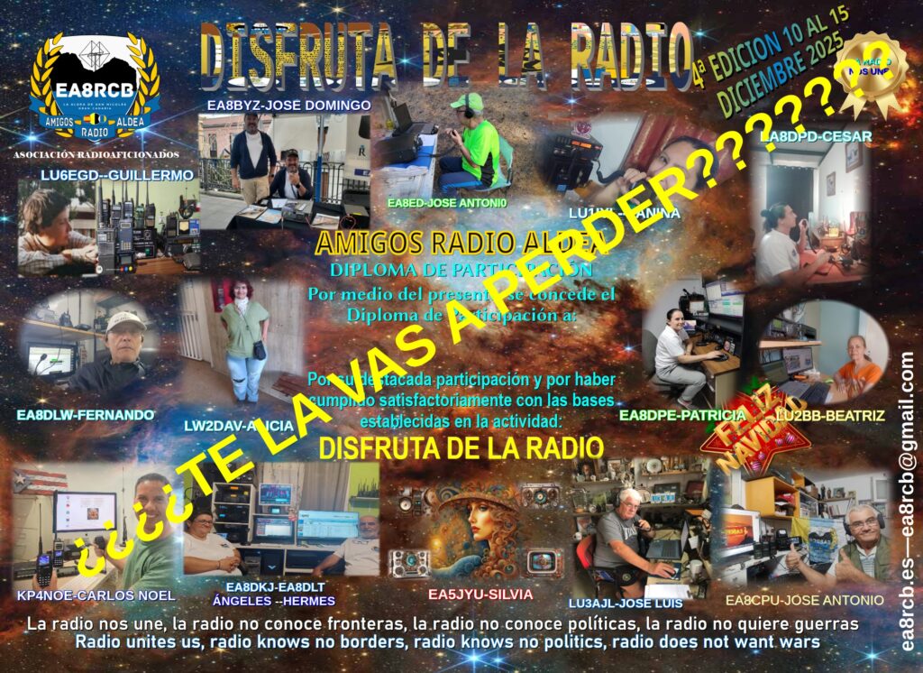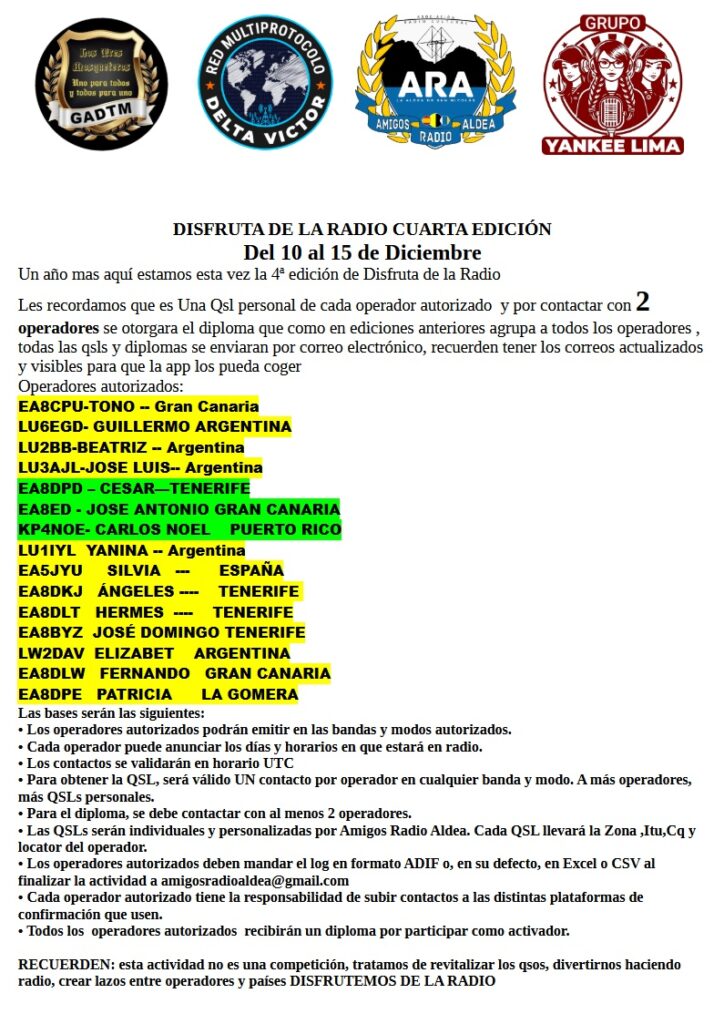 Un año más estamos con ustedes con La 4ª edición de Disfruta de la Radio solamente recordarles que las qsls se enviaran vía correo electrónico que se coge de qrz.com con lo que les pedimos que actualicen sus datos en esa plataforma, si ya anteriormente has contactado con Amigos Radio Aldea lo tenemos en nuestra base de datos, HASTA EL 30 DE NOVIEMBRE recibiremos operadores que quieran participar, el 1 de Diciembre subiremos la lista de operadores autorizados. Les dejamos las bases y animamos a participar es gratis y seguro disfrutaremos
